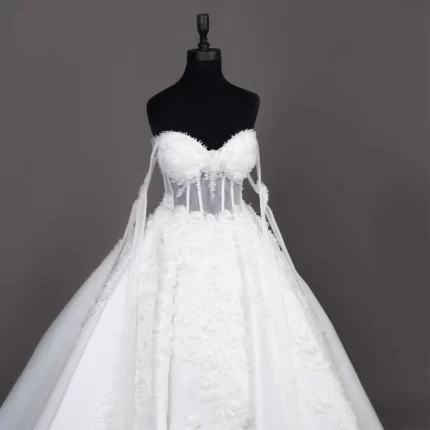 لباس عروس پرنسسی: برای عروسهایی که رویای یک ظاهر سلطنتی دارند، مدلهای پفدار با دنبالههای بلند و تزیینات ظریف، انتخابی ایدهآل هستند.