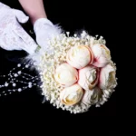 • پرهای زینتی: برای افزودن یک بافت خاص و حسی از سبکی و رهایی، از پرهای زینتی ظریف در میان گل‌ها استفاده شده است. پرها، نمادی از سبکی، آزادی و پرواز هستند و در ترکیب با شکوه پیونی‌ها و درخشش مروارید، تضادی هنری و جذاب ایجاد می‌کنند. این جزئیات، دسته گل را به یک انتخاب منحصربه‌فرد و فراموش‌نشدنی تبدیل می‌کند.