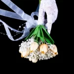 - ریسه مروارید: مهمترین عنصر تزئینی این دسته گل، ریسه مروارید است. یک رشته ظریف از مرواریدهای کوچک، به آرامی در میان گلها آویزان شده و با هر حرکت شما، درخشش ملایمی ایجاد میکند. مرواریدها نماد حکمت، خلوص و کمال هستند و این تزئین، دسته گل لاله را از یک طرح ساده، به یک قطعه جواهر تبدیل میکند. این ریسه، میتواند هماهنگی زیبایی با مرواریدهای به کار رفته در لباس عروس یا جواهرات شما ایجاد کند. این جزئیات نشاندهنده تعهد جیمنز به ارائه محصولاتی است که از هر نظر بینقص باشند.