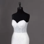 بخش اصلی این لباس، برش ماهی است که از بالاتنه تا زانوها به صورت فیت بدن بوده و سپس با یک دامن پرچین و پف‌دار، جلوه‌ای دراماتیک و باشکوه به خود می‌گیرد. این مدل، اندام شما را کشیده‌تر نشان می‌دهد و با تأکید بر خطوط بدن، یک سیلوئت بی‌نقص و زیبا خلق می‌کند. مدل ماهی برای عروس‌هایی که می‌خواهند ظاهری برجسته و خیره‌کننده داشته باشند، انتخابی ایده‌آل است و با هر قدم، وقار و اعتماد به نفس آنها را به نمایش می‌گذارد.